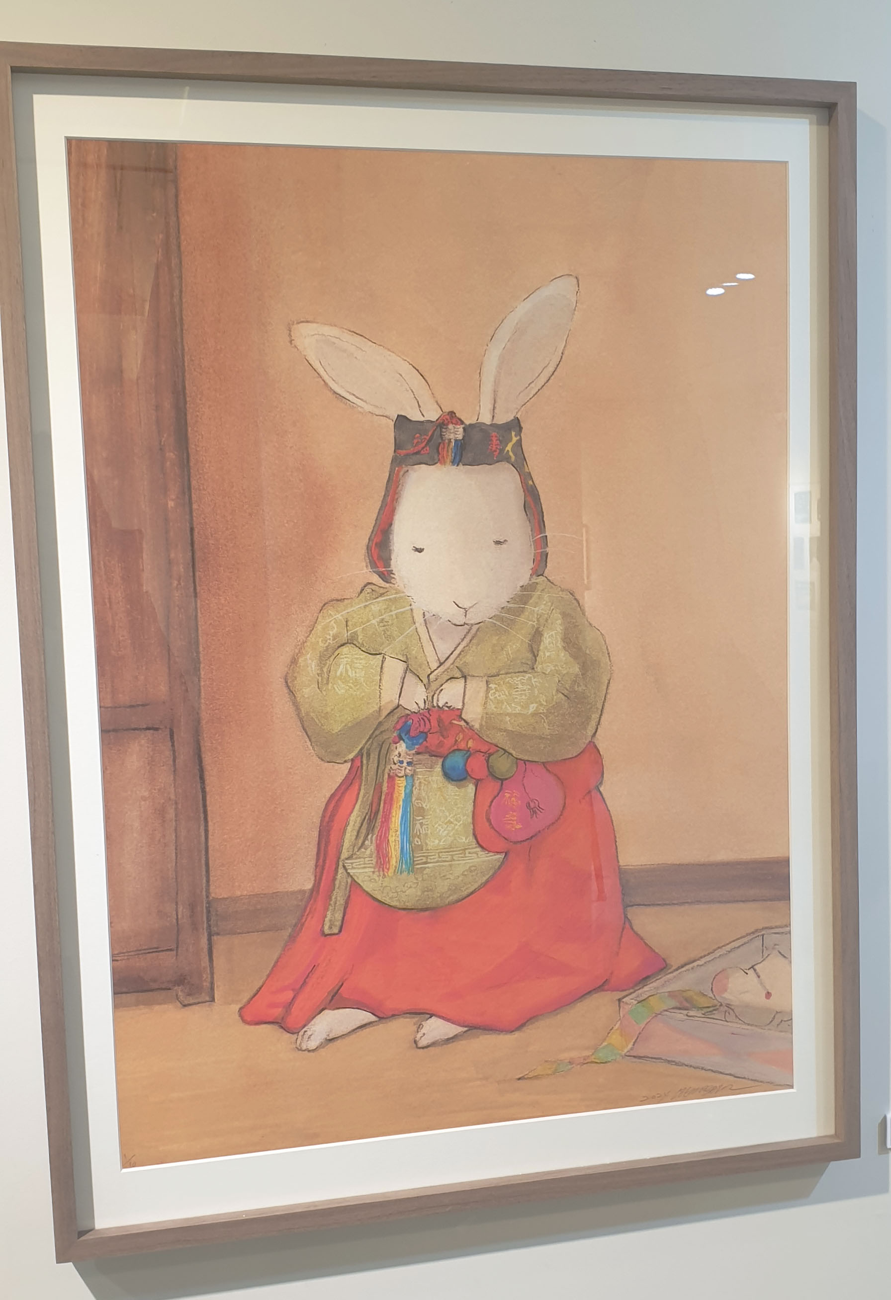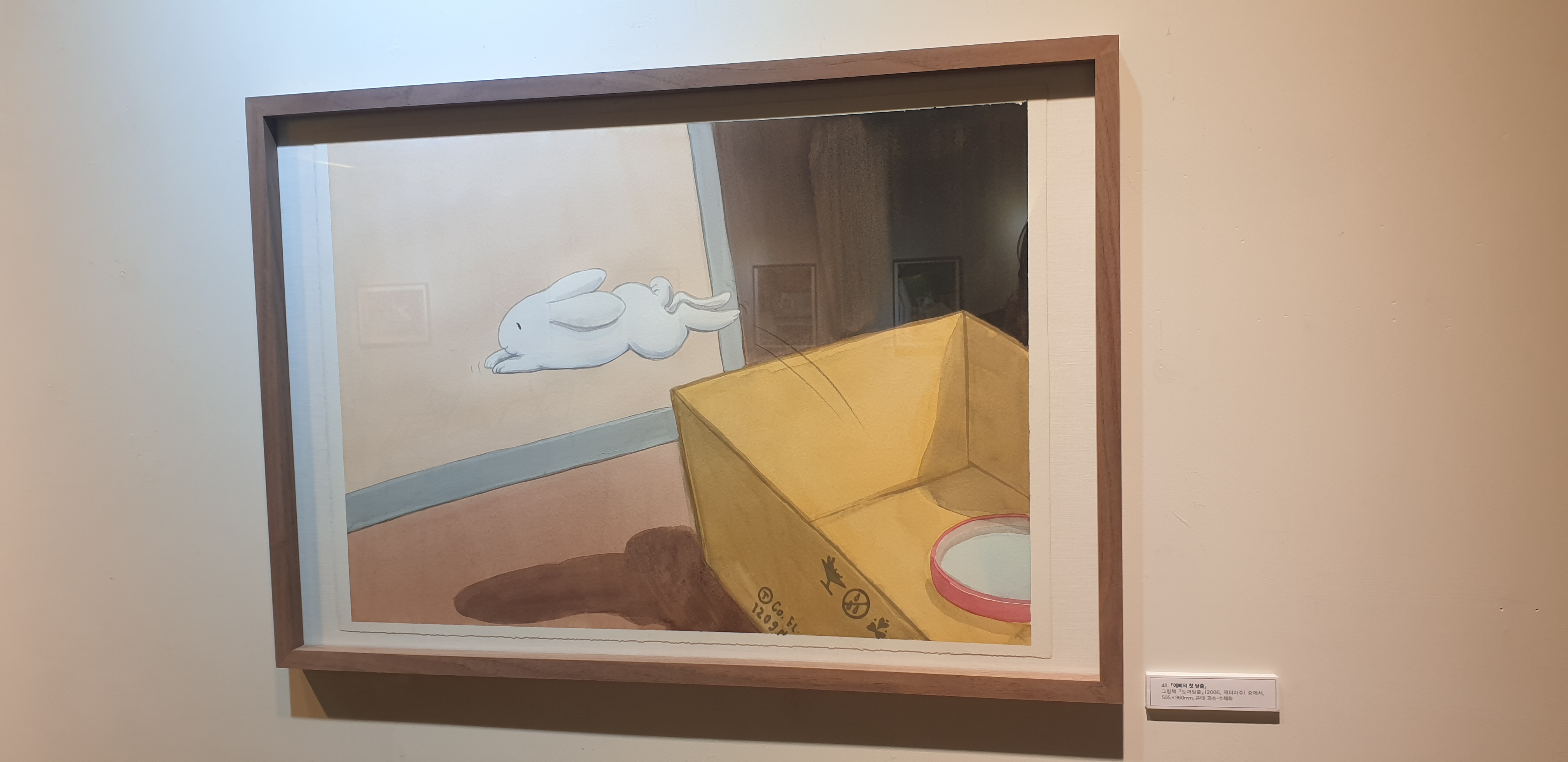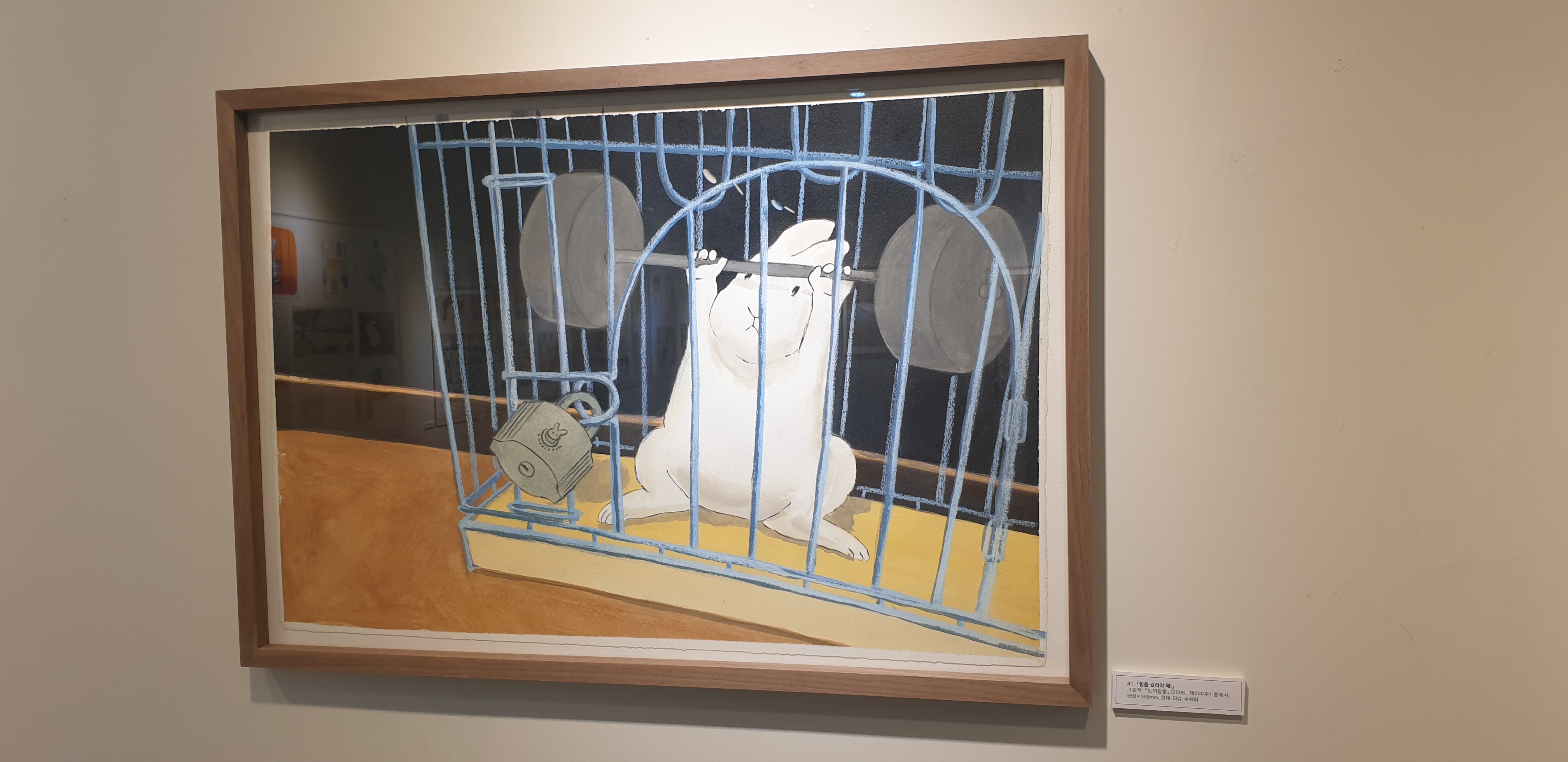그림책 토끼탈출의 원화도 만날수 있다. 우리 안에서 역기를 들고 운동하고, 책을 읽는 모습이 사람을 닮았다. 혹자는 무엇이든 하고싶어 하는, 학원 가느라 다람쥐 챗바퀴 돌리듯 생활하는 아이들의 모습을 떠올리기도 한다.